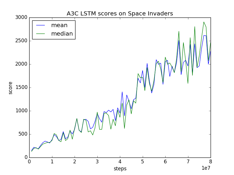 I also trained A3C LSTM for ALE's Space Invaders in the same manner with A3C FF. Training A3C LSTM took about 24 hours for 80 million training steps.