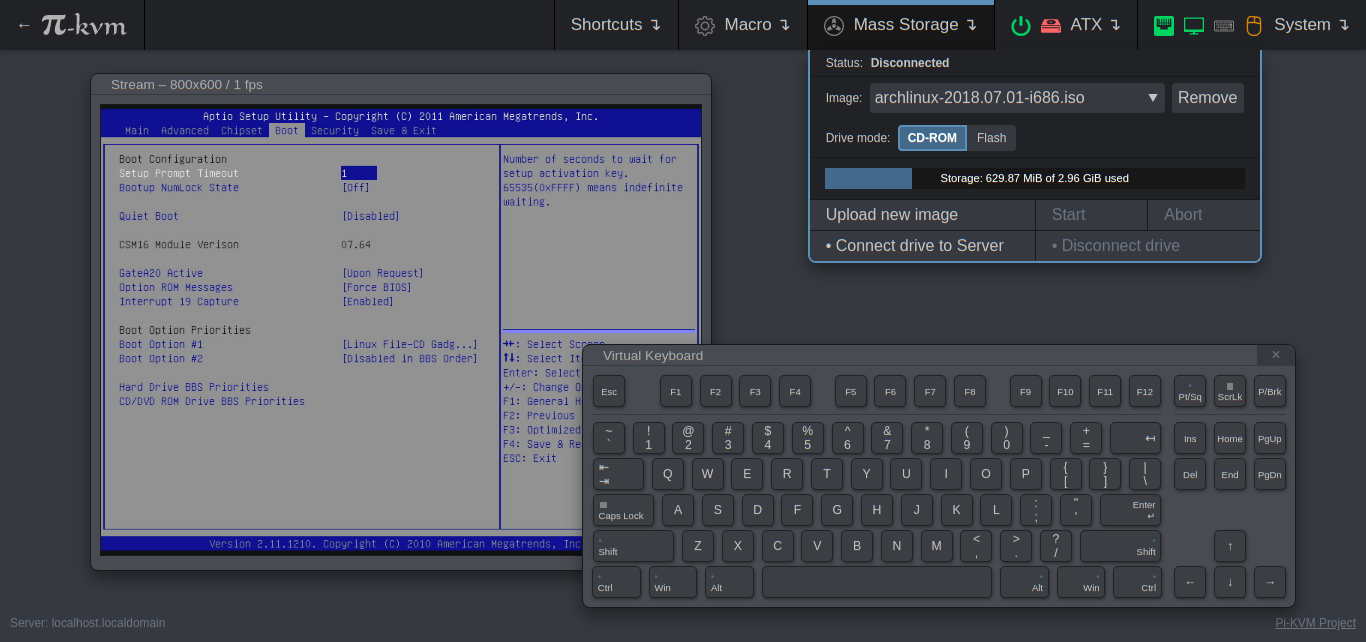 On the Raspberry Pi 4 and Zero2W, PiKVM can emulate a virtual CD/DVD or Flash Drive. A live image can be uploaded to boot the attached server. - ATX power management