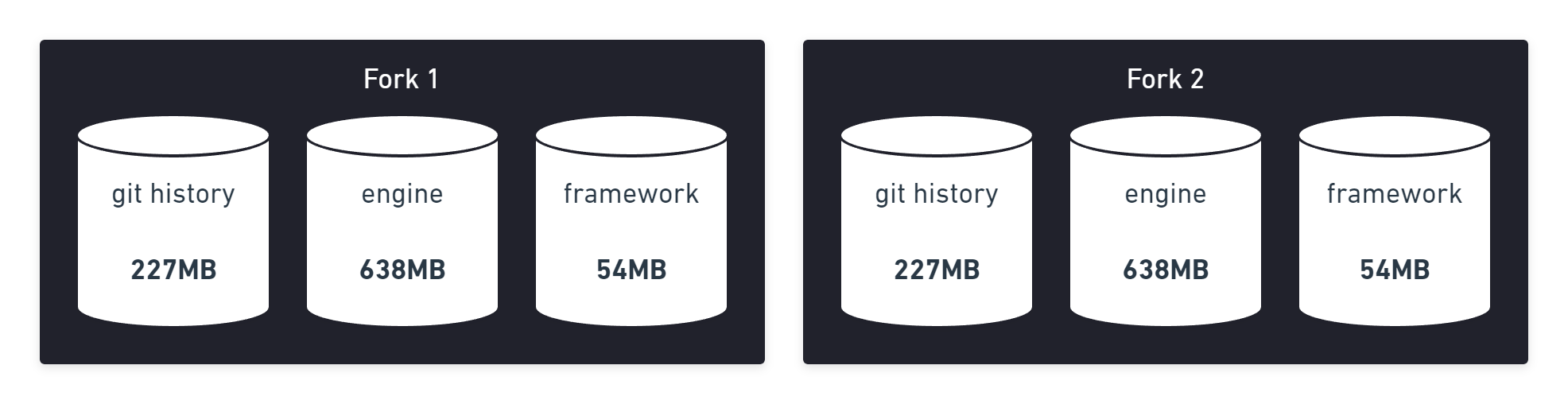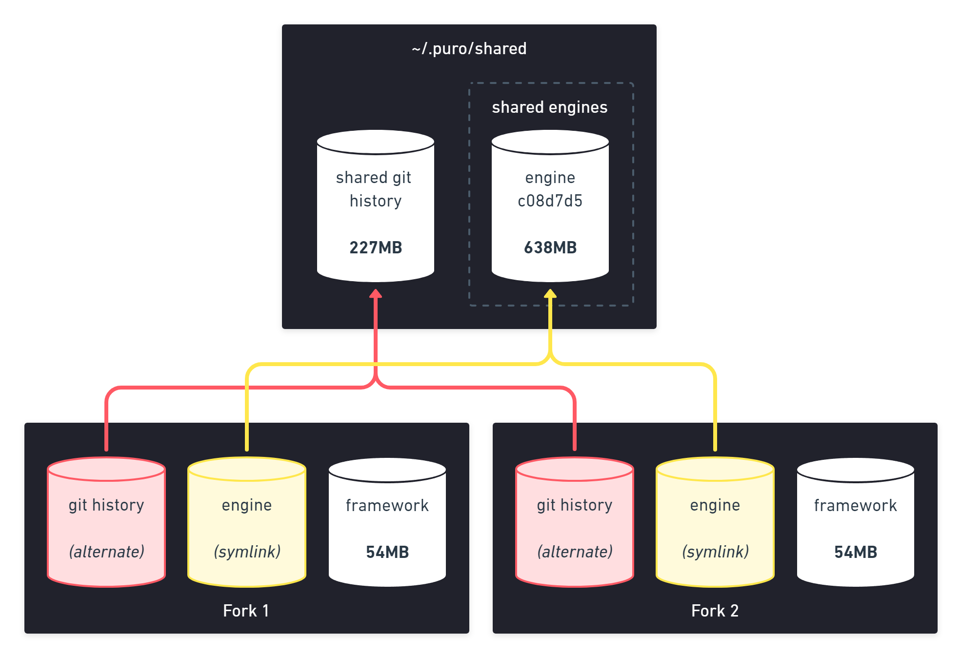 Puro implements a technology similar to GitLab's object deduplication to avoid downloading the same git objects over and over again. It also uses symlinks to share the same engine version between multiple installations: