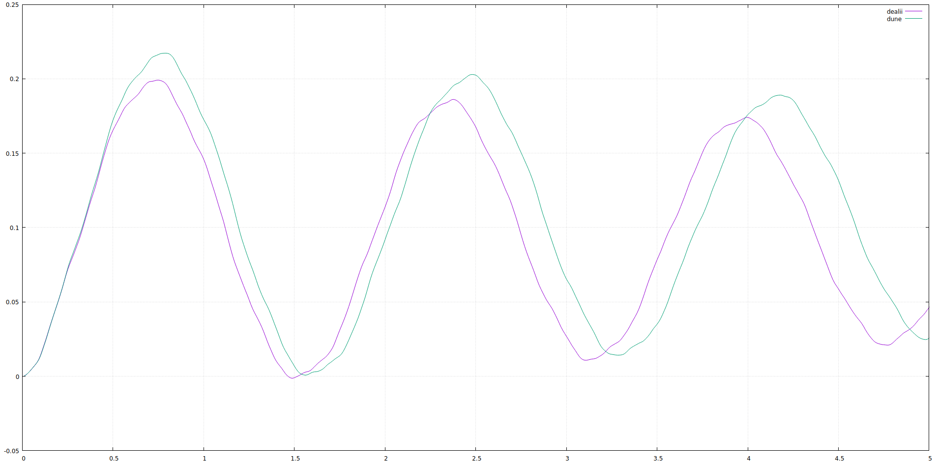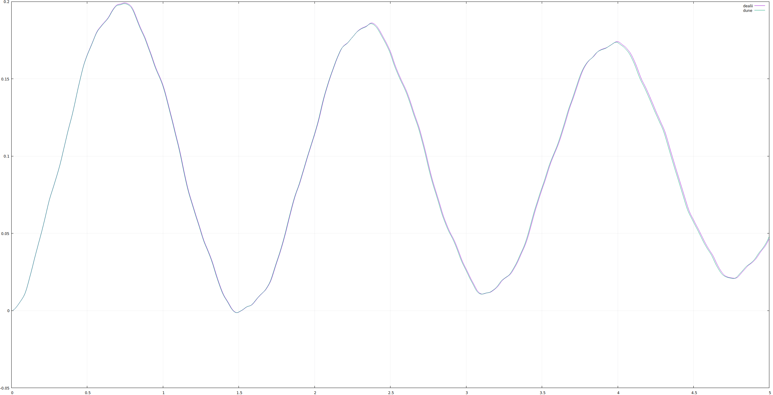 Yes, this works as well and it is faster and more compliant to the other tutorials. However, there is still some deviation between our other tutorials and the dune code here, even with the implicit time-stepper (as you probably know) Do you have any ideas about the reasoning? Method-wise, you use continuous finite-elements of polynomial degree 2 and an implicit Newmark time-stepping with |