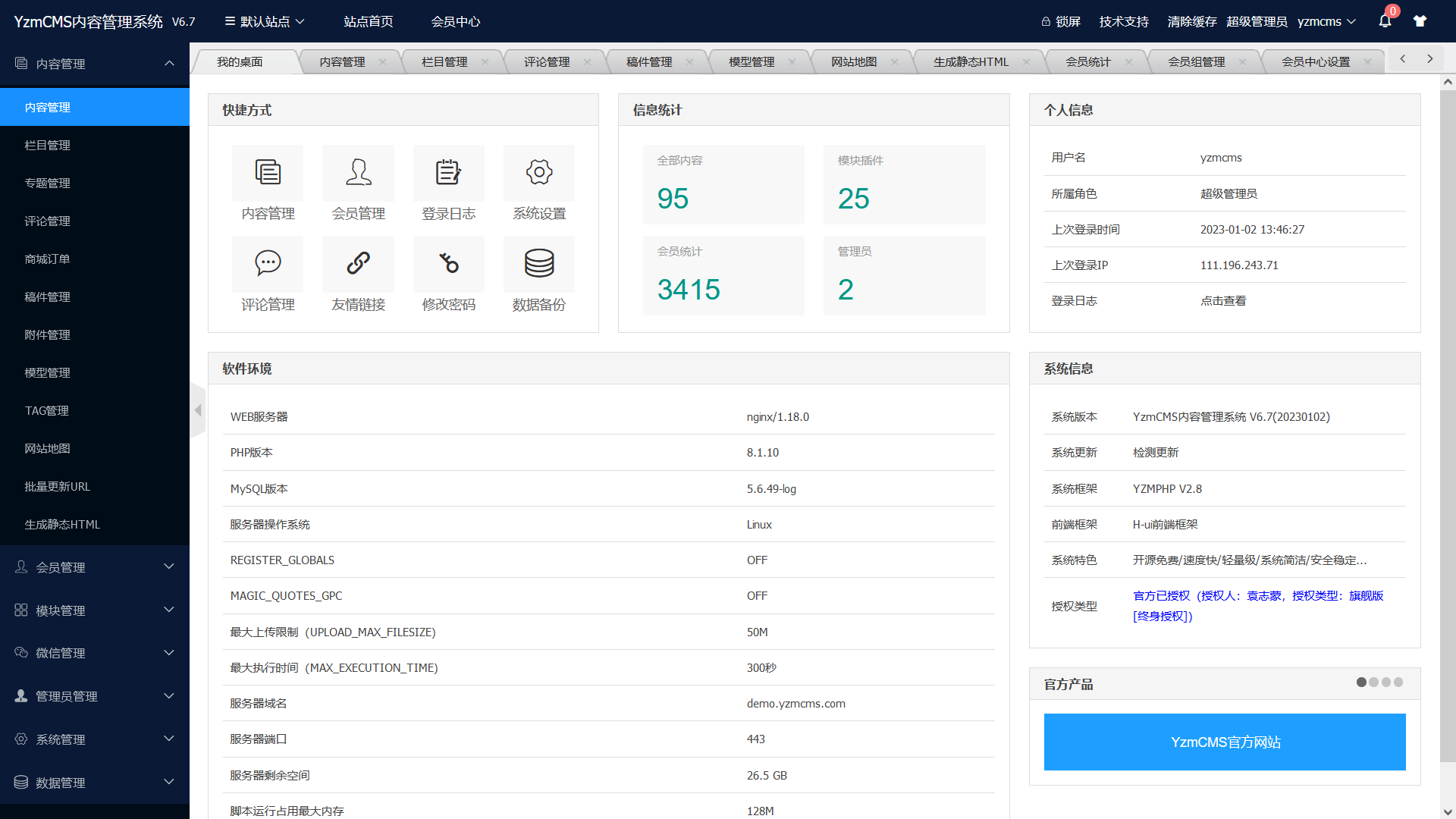 YzmCMS是一款轻量级开源内容管理系统,它采用自主研发的框架YZMPHP开发。基于PHP+Mysql架构,并采用MVC框架式开发的一款开源高效的内容管理系统,可运行在Linux、Windows、MacOSX、Solaris等各种平台上。