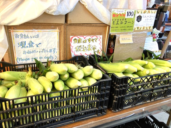 旬になると至る所で山積みになるとうもろこし。