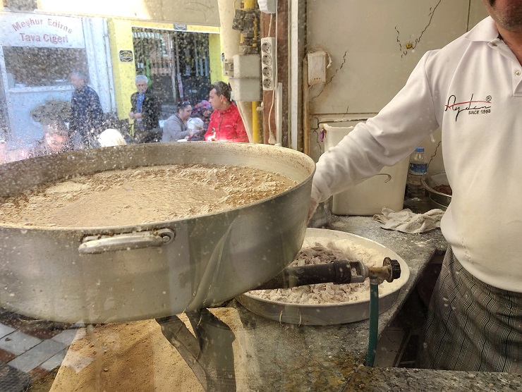 トルコ語で、タヴァは揚げ物、ジエルはレバーを意味します。レバーの唐揚げはエディルネの名物料理であり、歴史地区の街中では何軒ものタヴァ・ジエル屋さんが競うように営業しています。