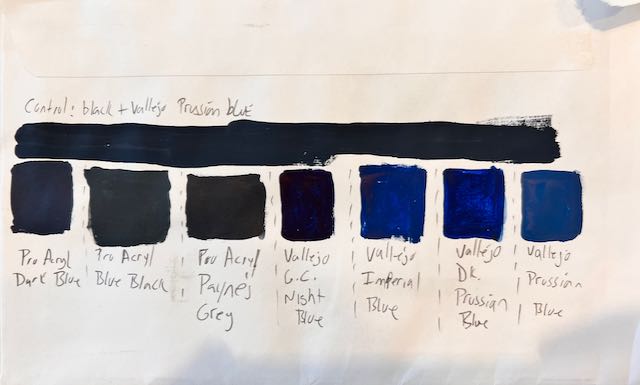 Here’s the experiment I ran. The control stripe across the top is a common base layer I see for “Napoleonic Blue” – a mix of 75% VMC Prussian Blue / 25% Black (I used Pro-Acryl Coal Black). The ratio is approximate based on ‘drops’ of paint… every time I mix it it’s a little different, but that’s OK, especially for depicting pre-industrial revolution clothing.