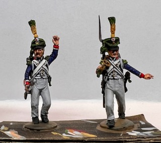 Here’s a few more Voltigeurs that could be a command base for a unit in skirmish order. The different parts in the Perry box allow you a good degree of freedom in posing models. Here we have a sergeant trying to get his unit’s attention along with a bugler trying to tell his squad mates to slow down.