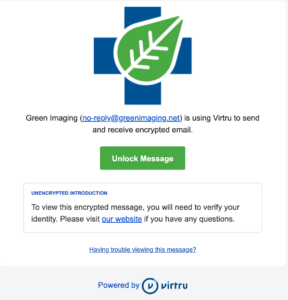 Green Imaging uses Virtru to send secure, encrypted email. If you’ve received a Virtru-protected message, that means someone from Green Imaging wants to share information with you in a secure manner. Virtru acts as a protective wrapper around sensitive emails, files, and other information that needs to be shared securely.