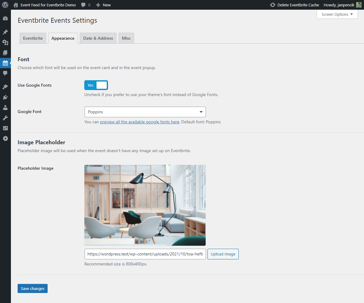 If you are not happy with the font provided by your theme, you can use any other font from Google fonts. You can also set the image placeholder for your events.
