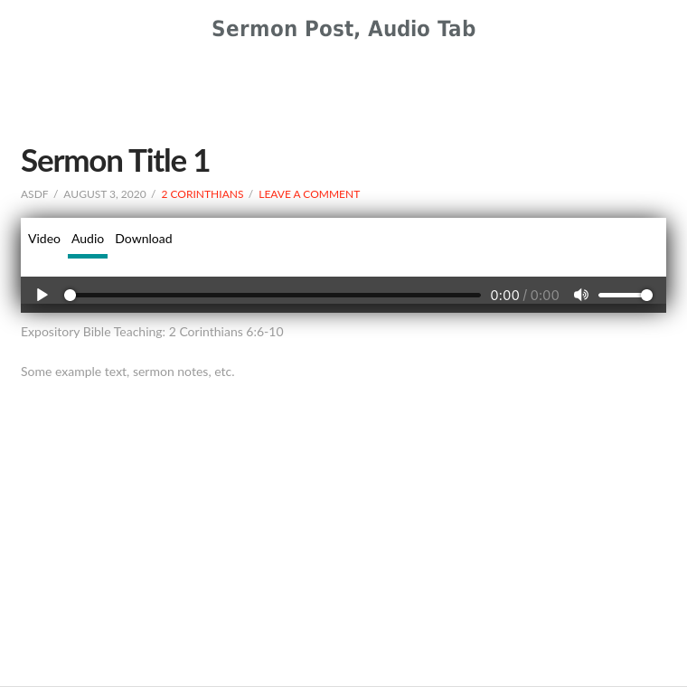 This plugin provides a “Sermons” post type that can be used to share video and audio sermons. When a sermon post is viewed, the video and audio are displayed in a user-friendly, tabbed format for “Video,” “Audio,” and “Download” (which allows the download of MP3 sermons).