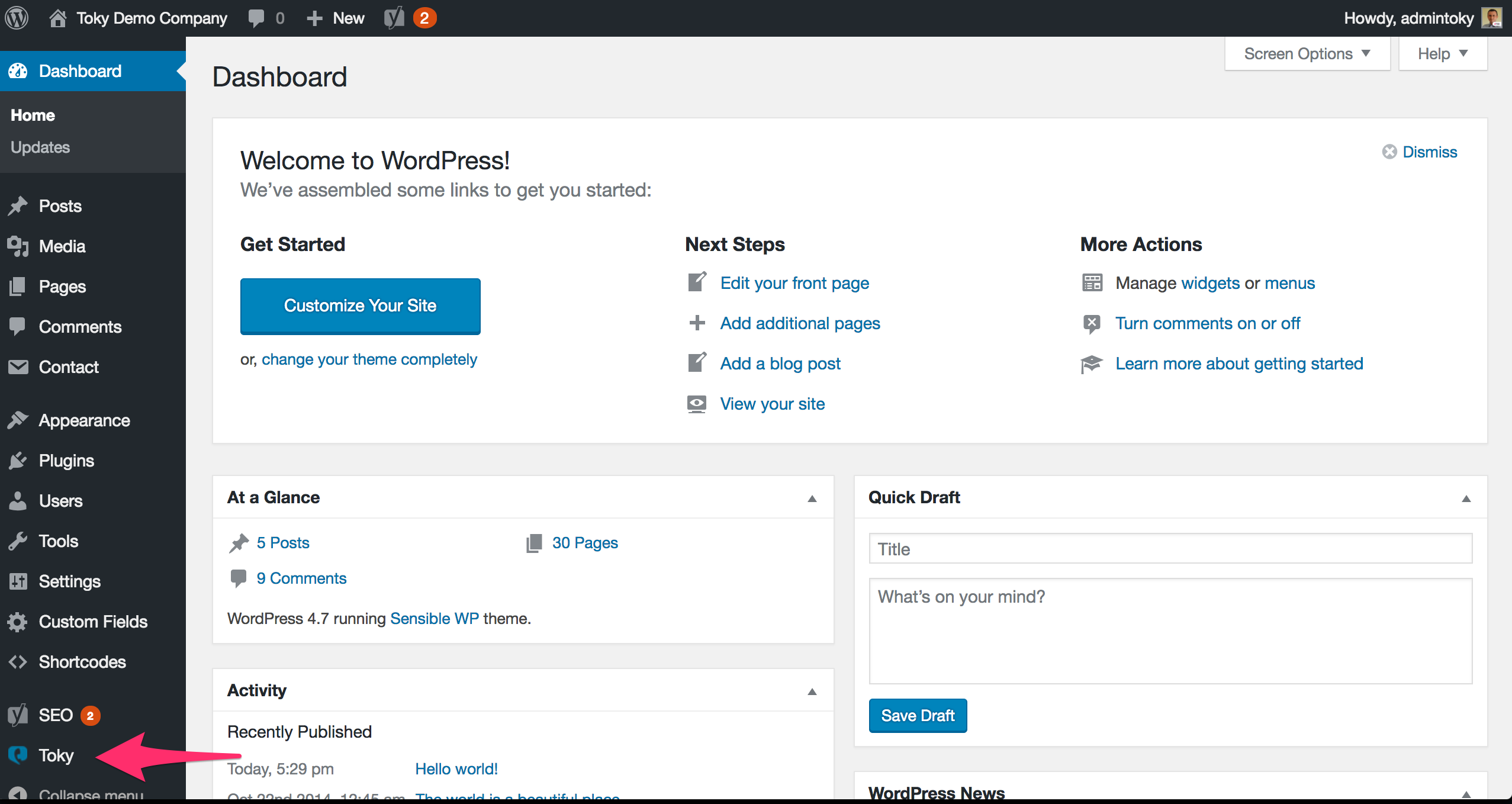 - Inside your WordPress admin panel, go to Toky’s settings page located in the sidebar menu.