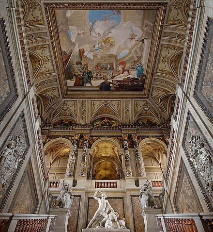 美術史美術館に入場すると大階段踊り場のテセウス像が目を引きます。これは、彫刻家としては古典派唯一の巨匠アントニオ・カノーバの代表作「ケンタウルスを倒すテセウス像」です。