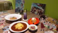 今回のオーダーはドリンクを1つ減らし、フードを増やした≪1増1減≫(選挙の区割りか!)。「麗奈の和風パスタ」と「麗奈のぱーぷるトランペット」に加えて「久美子の華麗なるおむらいす」「チューバくんのフルーツケーキ」を並べてみました。
