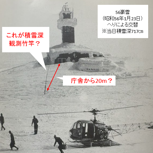 56豪雪の7.17m積雪深だって、この朝日新聞社の写真では観測竹竿が7.17m埋もれた高さが測候所の地盤面と同じくらいの高さに見えるよね?