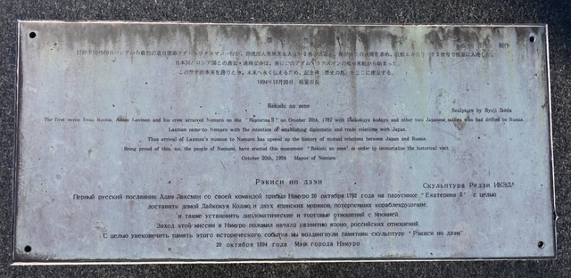 歴 史 の 然 池田良二 制作1792年10月20日ロシアから最初の遣日使節アダム・ラクスマン一行が、漂流民大黒屋光太夫ほか2名の送還と、我が国との通商を求め、帆船エカテリーナ2世号で根室に入港した。 日本国とロシア国との通交・通商交渉は、実にこのアダム・ラクスマンの根室来航から始まった。 この歴史的事実を誇りとし、未来へ永く伝えるため、記念碑「歴史の然」をここに建立する。 1994年10月20日 根室市長