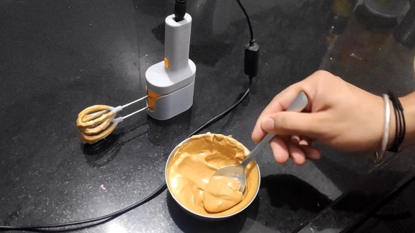 The inside is just as beautiful, mixing junk bin parts like the 6 V motor from a cassette deck with printed gears and beaters. At the risk of reviving an old debate, we hope [HimanshuS8] used food-safe filament for those. If you replicate this, you could try to design it around standard metal beaters instead. Check out the demo after the break while you wait for the water to boil.