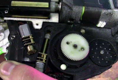 The clever bit is how the BBs are fed into the groove. Rather than have a separate mechanism to gate the feed port, there’s a backlash mechanism that opens the port when the motor powering the drum runs in reverse for a bit. It’s a clever use of cams to get the job done without adding an extra servo, which sort of reminds us of the design parsimony exhibited in his one-servo seven-segment display.