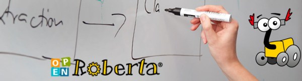 Open Roberta is the user-facing middleware in a chain of software and firmware bits that make a robot work in a classroom environment. For the students, everything runs inside a browser. OR provides a webserver, robot programming interface and language, and then converts the output of the students’ programs to something that can be used with the robots’ firmware. The robots that are used in classrooms are mostly based on the Lego Mindstorms EV3 platform because it’s easy to put something together in short order. (But if you don’t have an EV3, don’t despair and read on!)