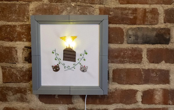 [Becky]’s gift to [Estefannie] is a busy intersection of maker elements including graphic design, embroidery, electronics, and 3D printing. [Becky] started with the embroidery, which was made possible thanks to a new open-source library for Processing called PEmbroider. Once that was done, she 3D printed the frame and added the electronics — candle flicker LEDs for the birthday cake, and a handful of songs that are accessible via touch contacts screwed into the side of the frame. [Becky] added a real-time clock module so it plays a few extra songs on [Estefannie]’s actual birthday.