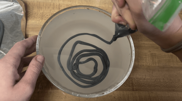 The string is an alginate-based bioplastic that can be made at home and is shaped in a way that it can be woven or knitted. Alginate comes primarily from seaweed, and it gels in the presence of calcium ions. [ombates] relies on this to make a goopy mixture that, once extruded into a calcium chloride bath, forms a thin rubbery length that can be dried into the strings you see here. By adding carbon to the mixture, the resulting string is darkened in color and also conductive.