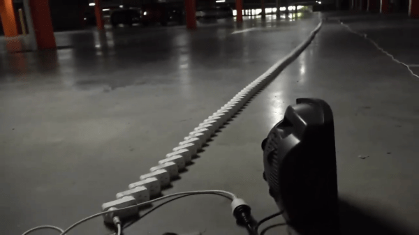 You may have seen some of the EEVblog dumpster dive videos, where [Dave Jones] occasionally finds perfectly good equipment that’s been tossed out. But this time, rather than a large screen monitor, desktop computer, or a photocopier, he features a stash of 283 electrical outlet double adapters that he found last year. He decided to perform a test in the parking lot, connecting all 283 adapters in series.