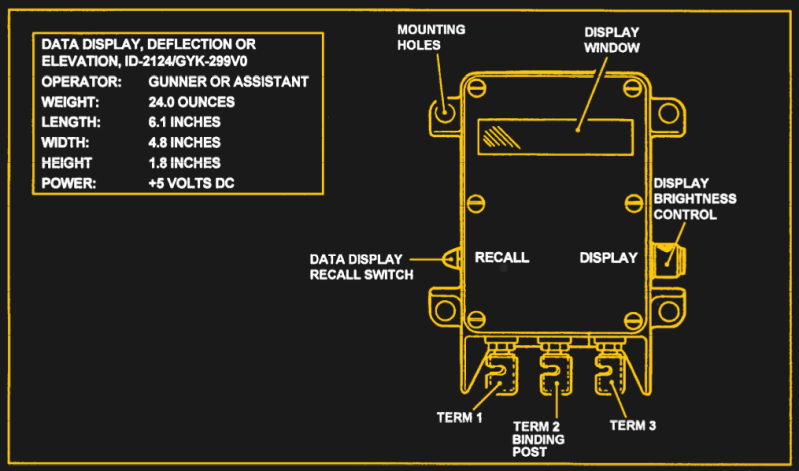 From this description we can surmise that the ID-2124 is used to display critical data to be used during the aiming and firing of the weapon. Further, the small size of the device and the use of binding posts seem to indicate that it would be used remotely or temporarily. Perhaps so the crew can put some distance between themselves and the artillery piece they’re controlling.