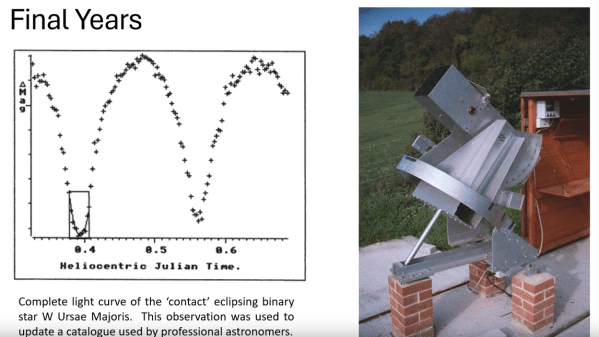 Sadly, [Jack Ells] died only two years after finishing the telescope. But he left it with his son, who eventually moved it to a location with better seeing conditions, where it gathered data for another eight years. The quality of the work is amazing, and as father-son projects go, this one is tough to beat.
