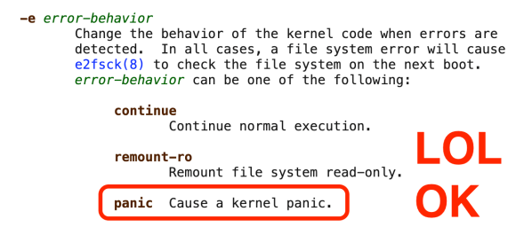 [Will] discovered this quirk when investigating the intricacies of the filesystem for problems and other vulnerabilities. A tool called tune2fs, used for administering and modifying ext filesystems, includes the ability to pass certain commands to the Linux kernel when certain situations arise with the filesystem itself, including that the kernel should panic. One situation is that the ext filesystem itself becomes corrupted, which can then cause the kernel panic. Armed with this knowledge, a USB drive can be purposefully given a corrupted ext filesystem which, when plugged into a Linux machine, can cause the computer to shut down.