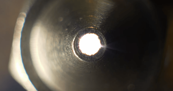 Unsurprisingly, each nozzle had a tiny hole at the end, although the roundness of the hole varied a bit from nozzle to nozzle. As you might expect, more expensive nozzles had better orifices than the cheap ones. Grabbing pictures of nozzles at magnification isn’t easy, so he set up a special image stacking setup to get some beautiful images (and he has another video on how that works).