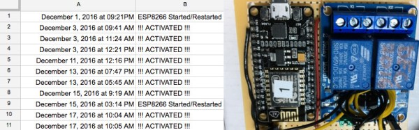 Whenever there is a transmission on one of the frequencies the radio is tuned to, the backlight turns on. Connecting the audio output to an oscilloscope, [WhiskeyTangoHotel] measured a 5V spike whenever this happens. Using a pair of diodes in series to drop the voltage to a safe level, the ESP8266 detects the voltage spike and updates a Google spreadsheet with the timestamp via IFTTT.