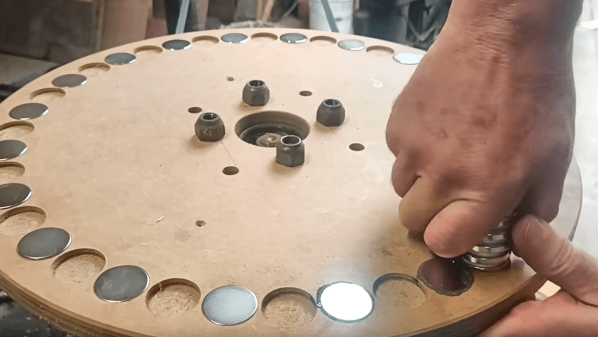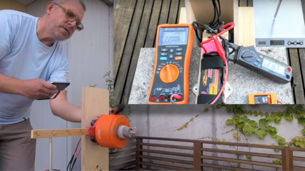 Granted, [Tim] from the Way Out West Blog is a long way from heating his home with a windmill. Last we checked, he didn’t even have a windmill built yet; this project is still very much in the experimental phase. But it pays to think ahead, and with goals of simplicity and affordability in mind, [Tim] built a prototype mechanical induction heater. His design is conceptually similar to an induction cooktop, where alternating magnetic fields create eddy currents that heat metal cookware. But rather than using alternating currents through large inductors, [Tim] put 40 neodymium magnets with alternating polarity around the circumference of a large MDF disk. When driven by a drill press via some of the sketchiest pullies we’ve seen, the magnets create a rapidly flipping magnetic field. To test this setup, [Tim] used a scrap of copper pipe with a bit of water inside. Holding it over the magnets as they whiz by rapidly heats the water; when driven at 1,000 rpm, the water boiled in about 90 seconds. Check it out in the video below.