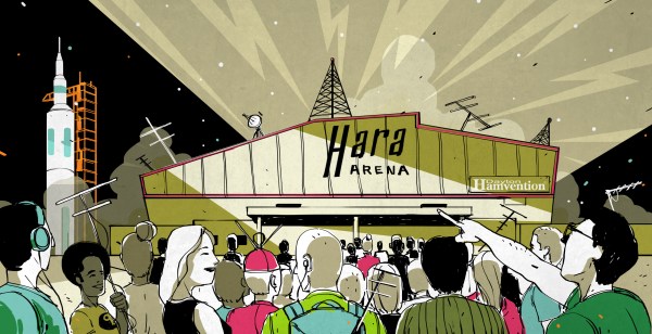 [Note: the Hara Arena, pictured in our awesome Joe Kim artwork, is the old home of Hamvention, and was demolished in 2016. Better head off to the Greene County Fairgrounds instead.]