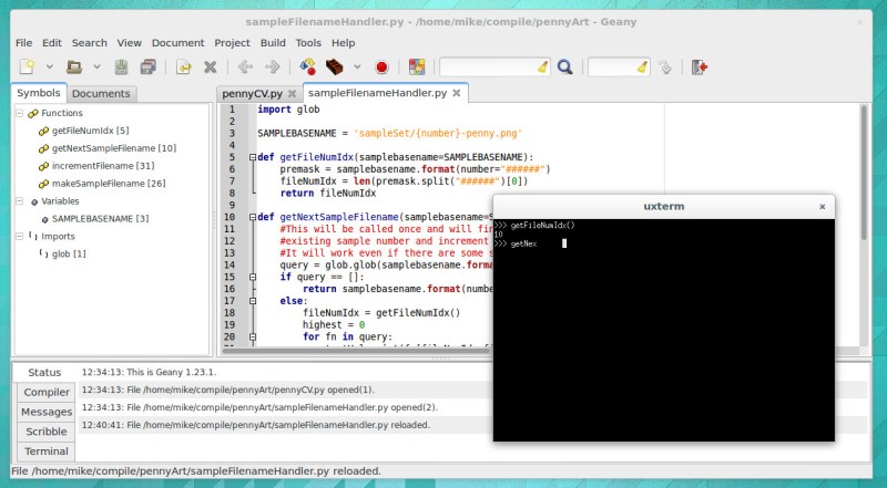 I’ve tried perhaps a half-dozen different Python IDEs now, spending the most time on two of them: Geany and Atom. Both are easy to install on Linux and provide the more advanced features I want for larger projects: better navigation, cross-file code completion (and warnings), variable type and scope indication.