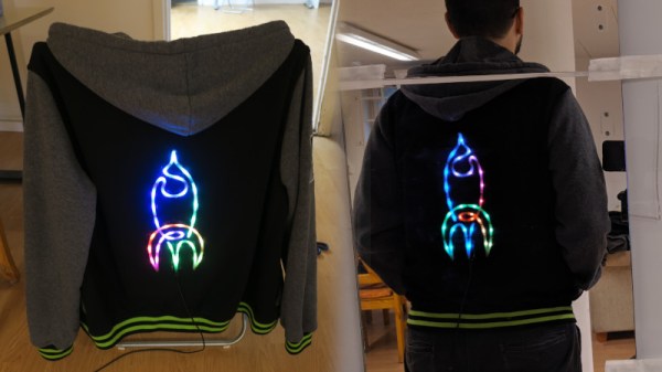 Making your own clothing can be fun, but it’s even better if you can throw some LEDs into the mix and give a new meaning to the term “glow up”. [arturo182] did just that with this custom rocket jacket for CCCamp2019.