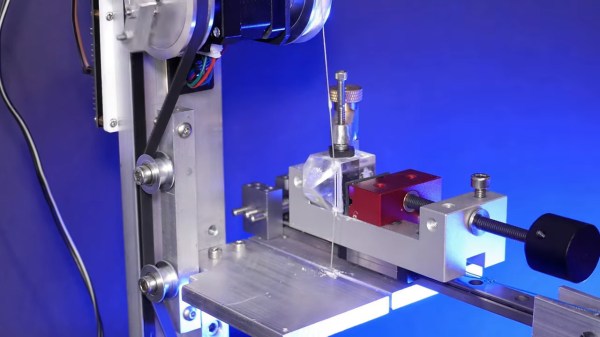 As with most of [Les]’s projects, there are hacks galore here, but the hackiest is probably the homemade diamond wire saw. The fragile KDP crystals need to be cut before use, and rather than risk his beauties to a bandsaw or angle grinder, [Les] threw together a rig using a stepper motor and some cheap diamond-encrusted wire. The motor moves the diamond wire up and down while a weight forces the crystal against it on a moving sled. Brilliant!