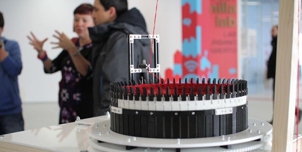 Previous knits: the Knit Universe, Bike-driven Scarf Knitter, Knitted Circuit Board.