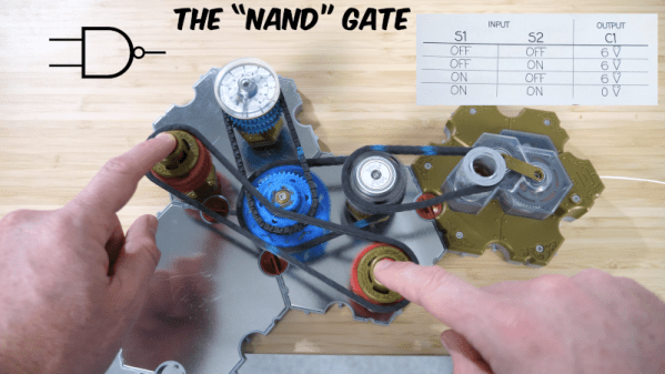 [Thomas] calls his invention capstan lever logic, presumably named after a type of winch used on sailing vessels. In this case, the capstan is the driven pulley system. The linked video shows him creating a number of equivalent circuits starting with an inverter and working his way up to a half adder and an RS flip-flop. While the amplifier pulley does take a minute to wrap one’s mind around, it really helps make the equivalent electronic circuit more intuitive. We’ve seen similar builds before as well which use pulleys to demonstrate electronic circuits, but in a slightly different manner than this build does.