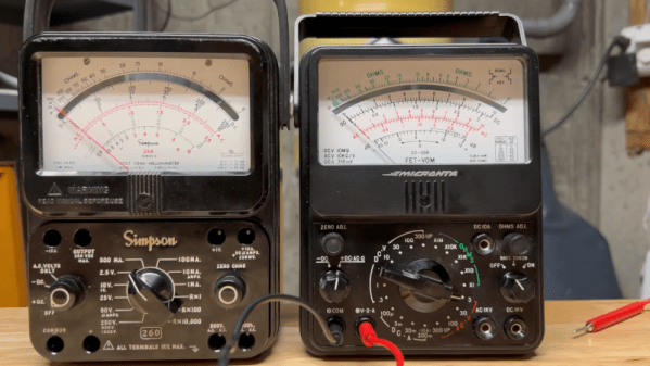 We are spoiled with multimeters today. Even the cheapest meter you will get these days is almost surely digital with a tremendous input impedance. But a few decades ago, meters were almost always analog affairs. To make a precise measurement, you needed a mirror under the meter to ensure you read the needle correctly. Moreover, a common meter wouldn’t have that high of an input impedance. If you spent more, you could get a VTVM and, later, one that used FETs to provide high input impedance. [Peter AA2VG] just picked up a vintage Micronta FET volt-ohm meter to join some of the other new and old meters in his shack. You can check it out in the video below.