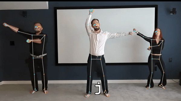 This is another one of [Fletcher Heisler]’s alternative inputs projects, in the vein of his face-operated coding keyboard. The idea there was to be able to code with facial gestures while cradling a sleeping baby; this project is quite a bit more expressive. Pretty much all you need to know about the technical side of the project can be gleaned from the brilliant “Hello world!” segment at the start of the video below. [Fletcher] uses OpenCV and MediaPipe’s Pose library for pose estimation to decode the classic flag semaphore alphabet, which encodes characters in the angle of the signaler’s extended arms relative to their body. To extend the character set, [Fletcher] added a squat gesture for numbers, and a shift function controlled by opening and closing the hands. The jazz-hands thing is just a bonus.