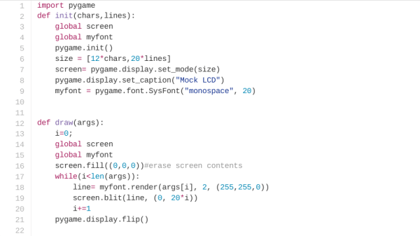 [Prashant]’s code relies on the use of Pygame, a set of Python modules designed for writing games. His code uses just two functions – one to define the LCD (characters and number of lines) while the other draws the characters on the screen by looking up an array. The code is just under 20 lines and available from his Github repo. It will be useful to those who are getting started on Python to help them understand some basics. Python is awesome and writing Python code is pretty simple.