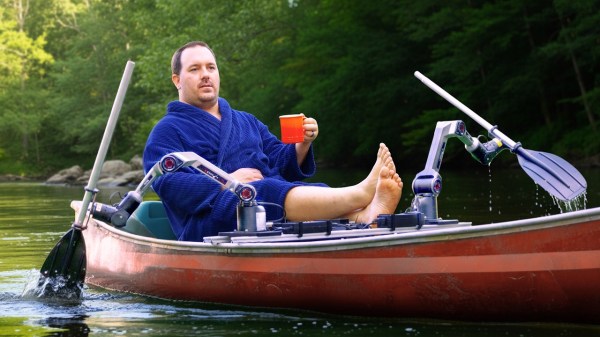Most robots get around with tracks or wheels, but [Dave] had something different in mind. Sufficiently unbothered by the prospect of mixing electronics and water, [Dave] augmented a canoe with twin, paddle-bearing robotic arms to bring to life a concept he had: the RowboBoat. The result? A canoe that can paddle itself with robotic arms, leaving the operator free to take a deep breath, sit back, and concentrate on not capsizing.