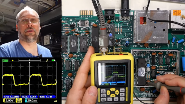 [Adrian] had a Commodore computer to fix and decided to see how his latest tiny portable scope would work. He paid $57 for the tiny little test instrument although the current price seems higher. It claims to have 120MHz bandwidth along with 500 megasamples per second. There are several versions with different claimed specs, but we did find a similar device for under $60. You can see the unboxing and how it worked in the video below.