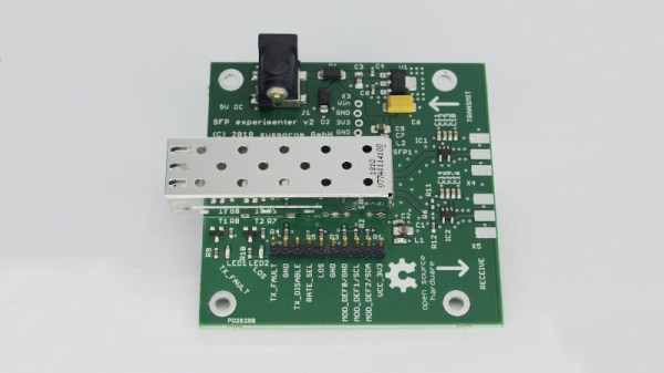 if you’ve cast you eye over any fibre networking equipment recently, you’ll be familiar with SFP ports. These are a standard for plug-in fibre terminators, and they can be had in a wide variety of configurations for different speeds, topographies, and wavelengths. They’re often surprisingly simple inside, so he wondered if he could use them to carry TOSLINK instead of a more conventional network. And it worked, with the simple expedient of driving an SFP module with an LVDS driver to make a differential signal. There follows a series of experiments calling in favours from friends with data centre space in various locations around London, finally ending up with a 140 km round trip for CD-quality audio.