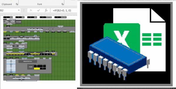 Perhaps the most tantalizing aspect of this approach is that it provides a very good visual way to indicate what is happening inside the system using color codes and clearly segregated and marked functional elements. Not only can it be programmed manually, but [Inkbox] also created an assembler for the CPU’s ISA – called Excel-ASM16 – all of which is available from the ExcelCPU GitHub project page. The ASM is assembled into a ROM.xlsx file that can then be run by the CPU.xlsx file by triggering the Read ROM button. After this you are confronted with the realization that although it all works, it’s also incredibly slow, at about 2-3 Hz.
