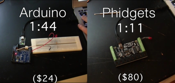 The three time trials were common tasks: 1. Blink an LED. 2. Use a pot to turn a servo. 3. Build a pedometer. For [Ken], the Phidgets won in each of the three experiments, but not significantly: 37%, 45%, and 25% respectively. The difference is only minutes. Even considering time value, for most hackers it is not worth the cost.