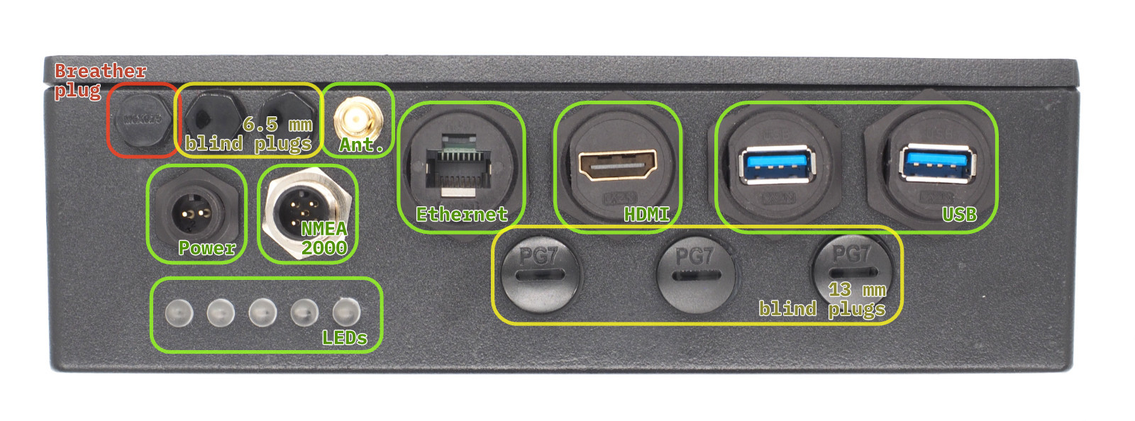 Powered by the Raspberry Pi Compute Module 5, the electronics are housed in a heavy duty enclosure made of aluminium, which also serves as a heat sink, and closes with a waterproof seal. It has a wide variety of external connectors, all likewise waterproofed: power, HDMI, NMEA 2000 and NMEA 0183, Ethernet, two USB 3.0 ports, and an external WiFi or Bluetooth antenna. The external ports are plugged into the carrier board by short extension cables, and there are even more ports on the carrier board, including two HDMI connectors, two MIPI connectors, four USB ports, and a full GPIO header. The case has plugs to install additional PG7 or SP13 waterproof connectors, so if the existing external connectors aren’t enough, you can add your own.