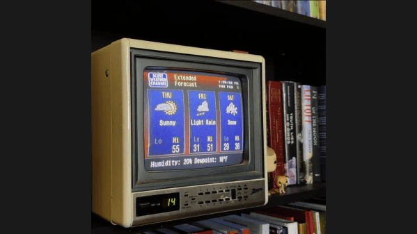 Recreating the retro look and feel of the Weather Channel experience is what this 1990s-style weather feed is all about, and we have to say that [Mitchell Scott] knocked it out of the park. Luckily, a lot of the heavy lifting was done already thanks to the WeatherStar 4000+ emulator project, which renders forecasts using online weather APIs in the distinctive retro graphics The Weather Channel used back in the day. He combined the graphics with the original smooth jazz soundtracks that TWC used back then; they’re online, because of course they are.