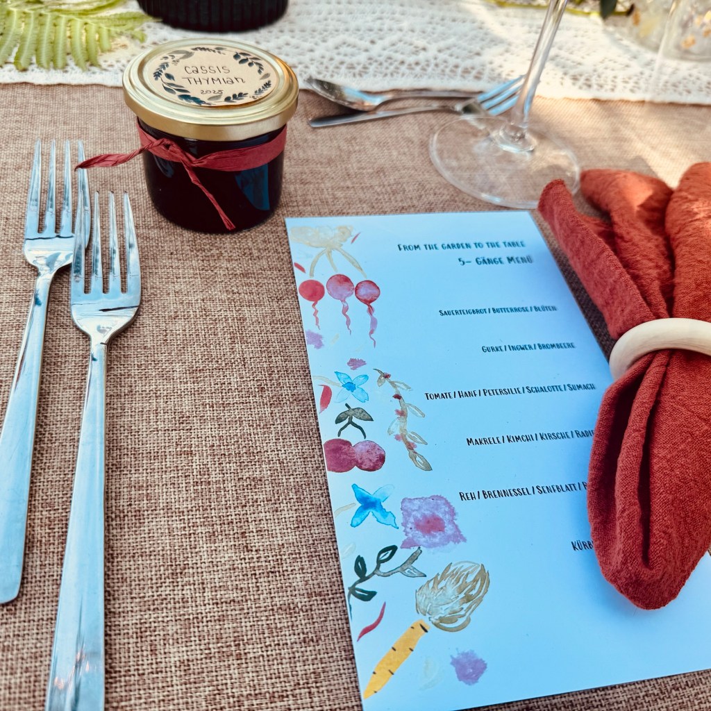 Es begann mit dieser von Lena handgemalten Menükarte. Die Tische waren liebevoll eingerichtet. Alle Gäste bekamen ein Glas Cassis-Marmelade geschenkt.