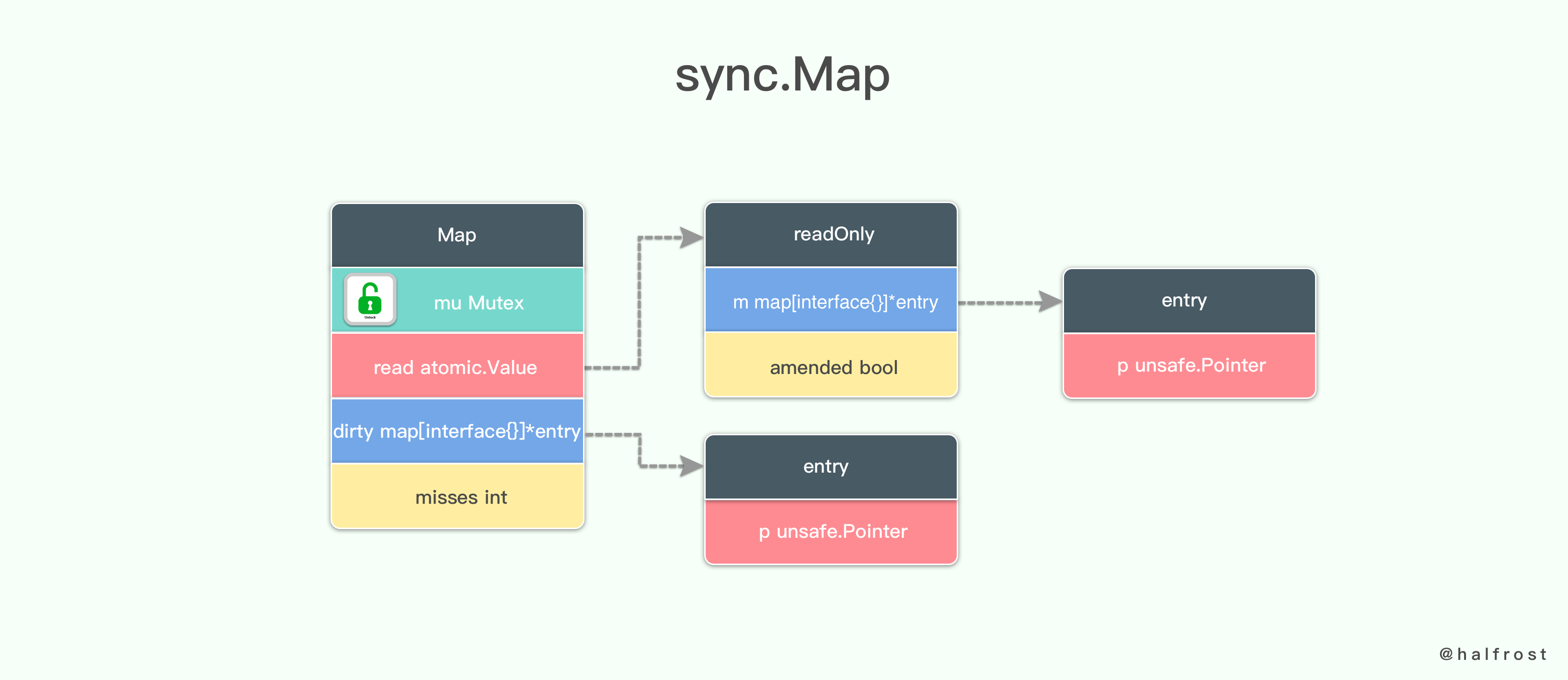 可见 Go 1.9 一上来第一个版本就直接摒弃了 Segment 的做法,采取了 CAS 这种 Lock - Free 的方案提高性能。但是它并没有对整个字典进行类似 Java 的 Node 的设计。但是整个 sync.map 在 ns/op ,B/op,allocs/op 这三个性能指标上是普通原生非线程安全 Map 的三倍!