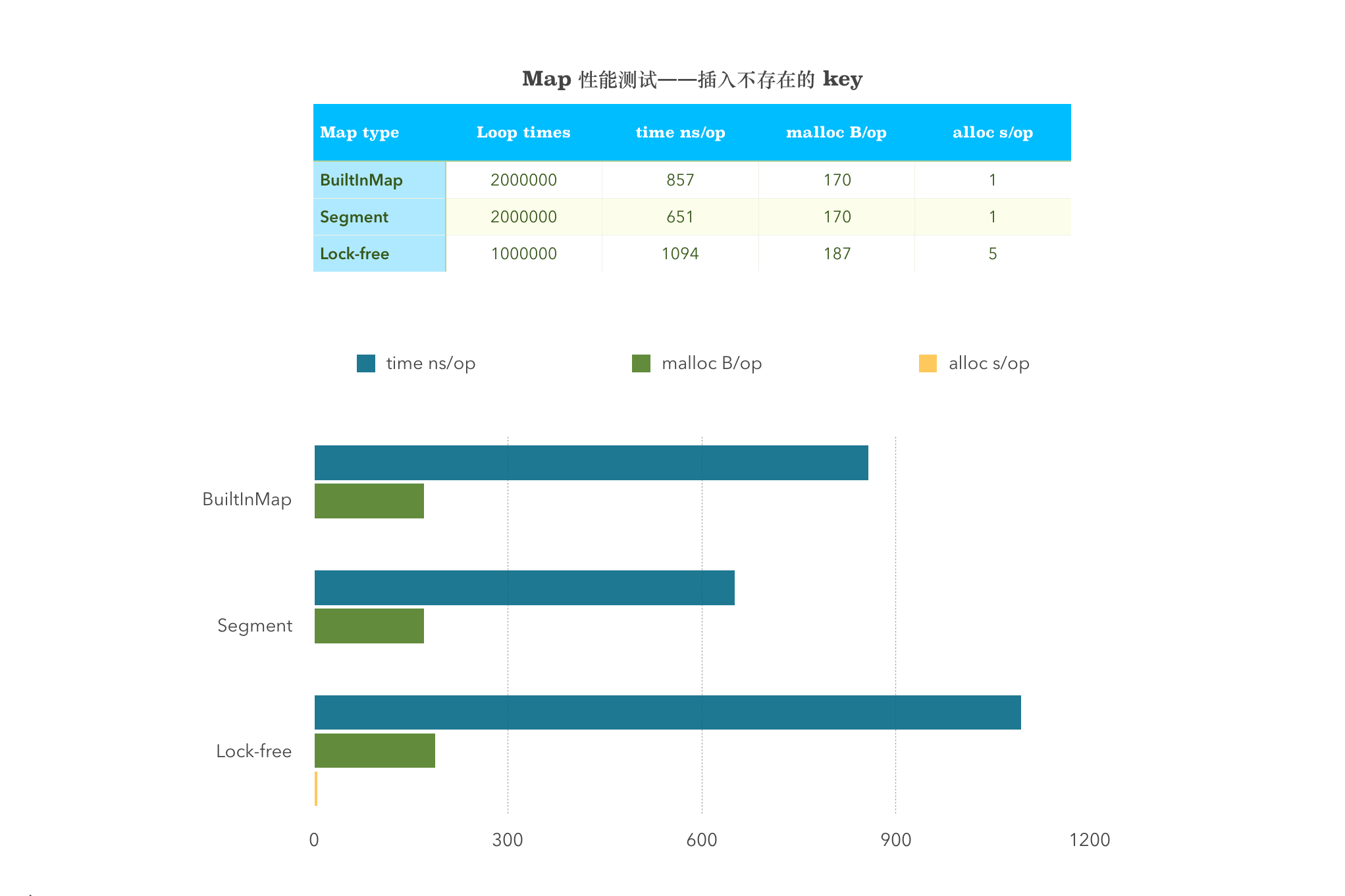 从图中可以看出,sync.map 在涉及到 Store 这一项的均比其他两者的性能差。不管插入不存在的 Key 还是存在的 Key,分段锁的性能均是目前最好的。