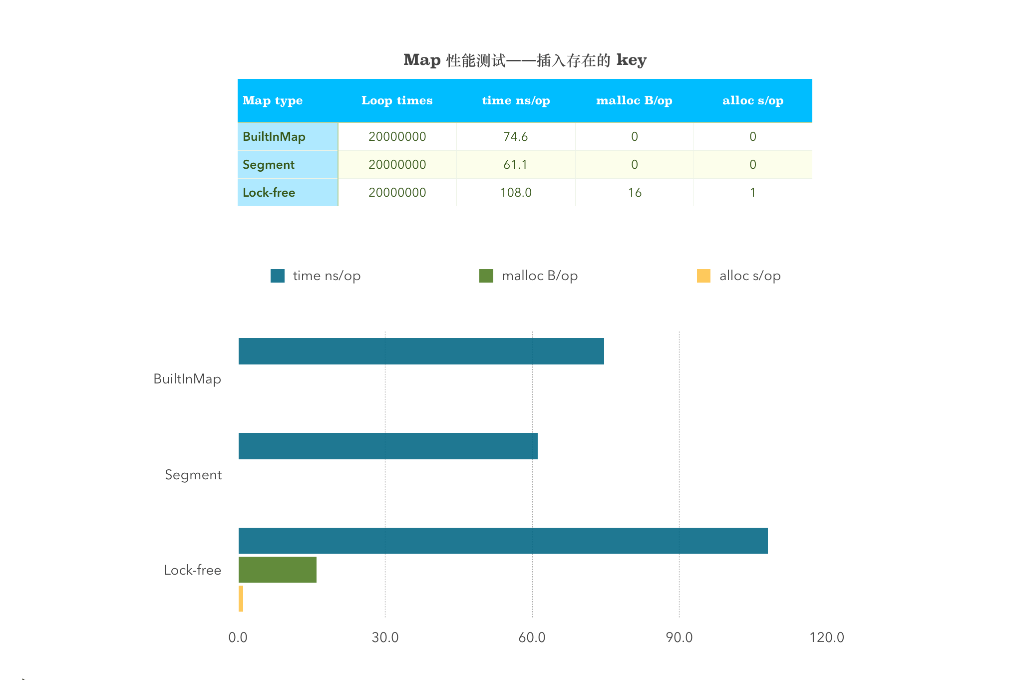 BenchmarkSingleInsertPresentSyncMap-4 20000000 108 ns/op 16 B/op 1 allocs/op