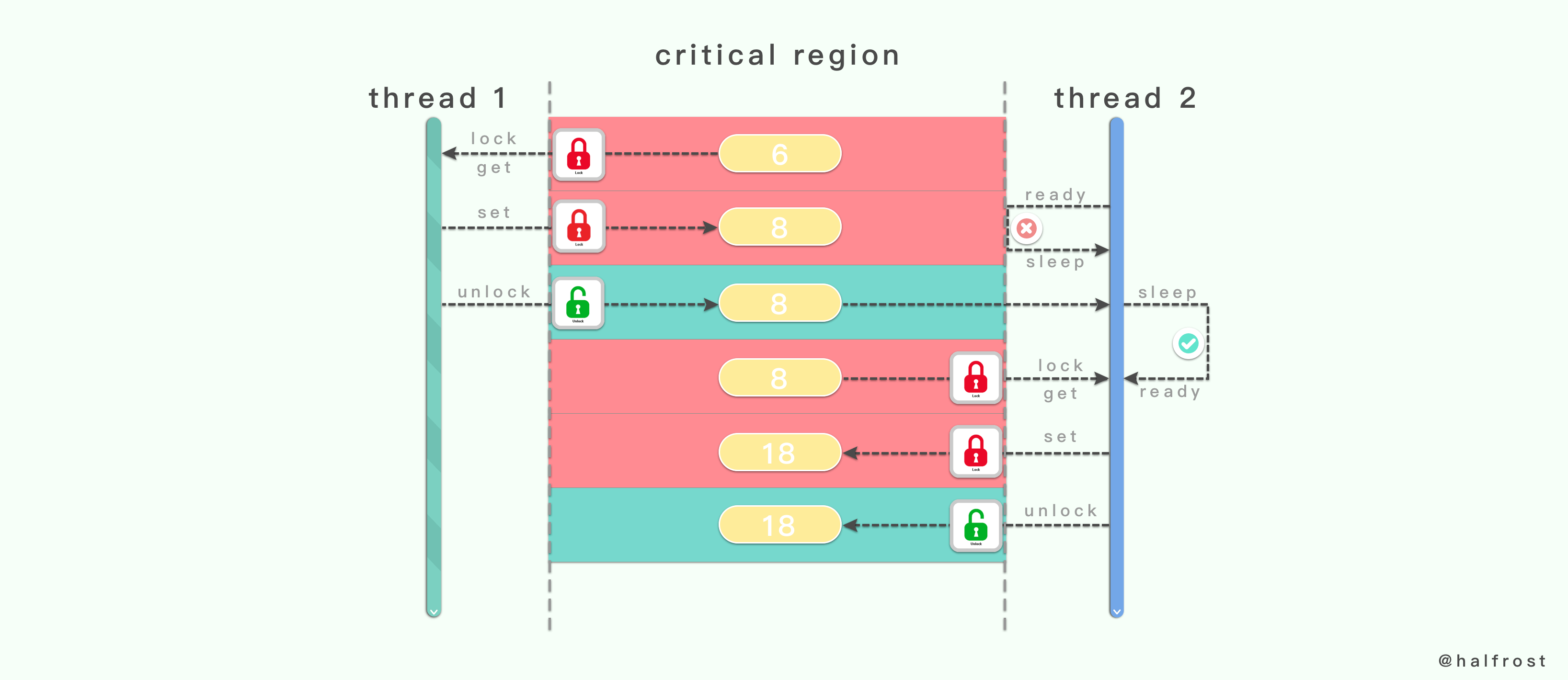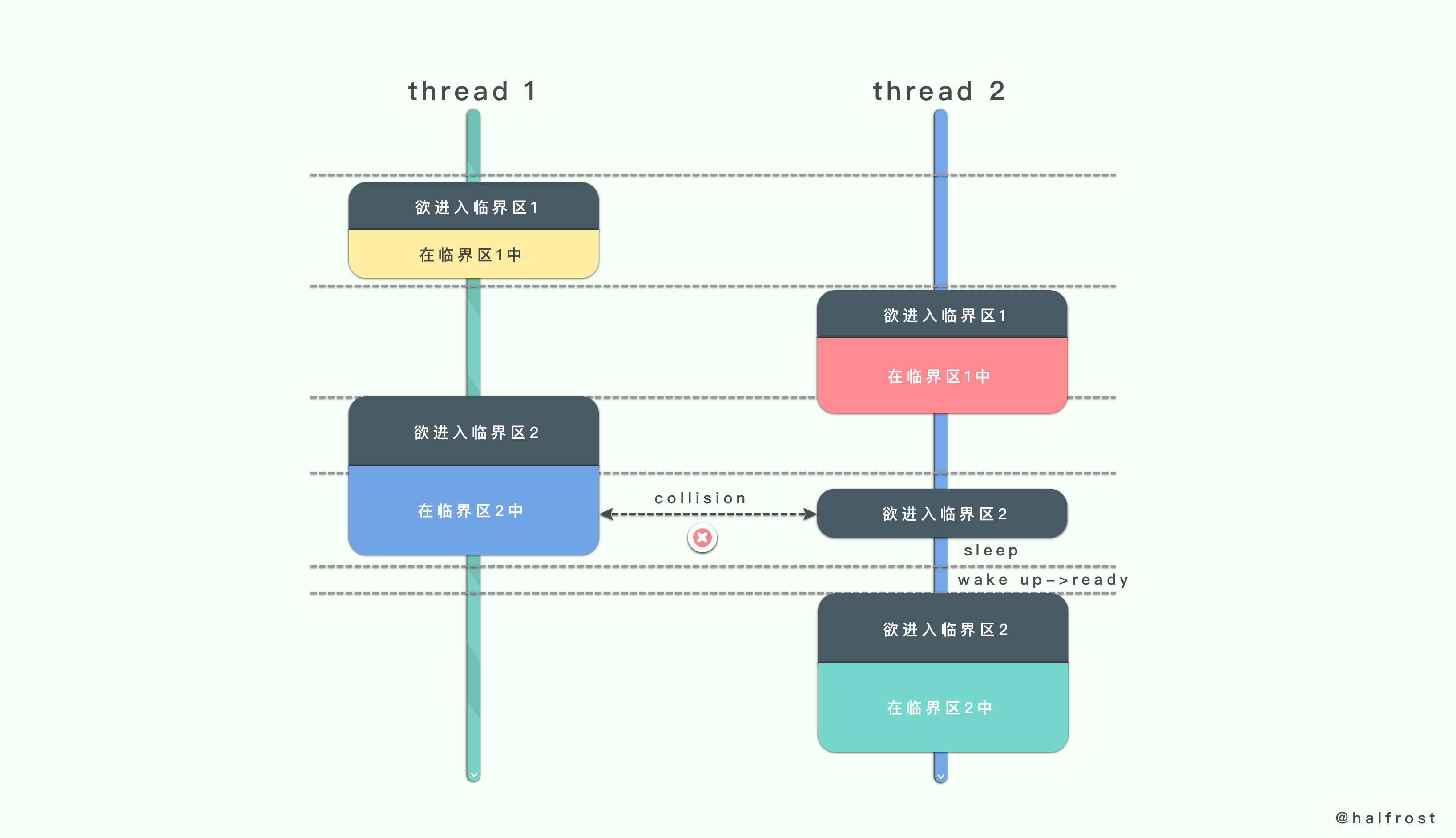当线程1完成所有的操作以后,线程1调用解锁操作。当临界区被解锁以后,会尝试唤醒正在睡眠的线程2。线程2被唤醒以后,由睡眠状态再次转换成就绪状态。线程2准备进入临界区,当临界区此处处于未上锁的状态,线程2便将临界区上锁。